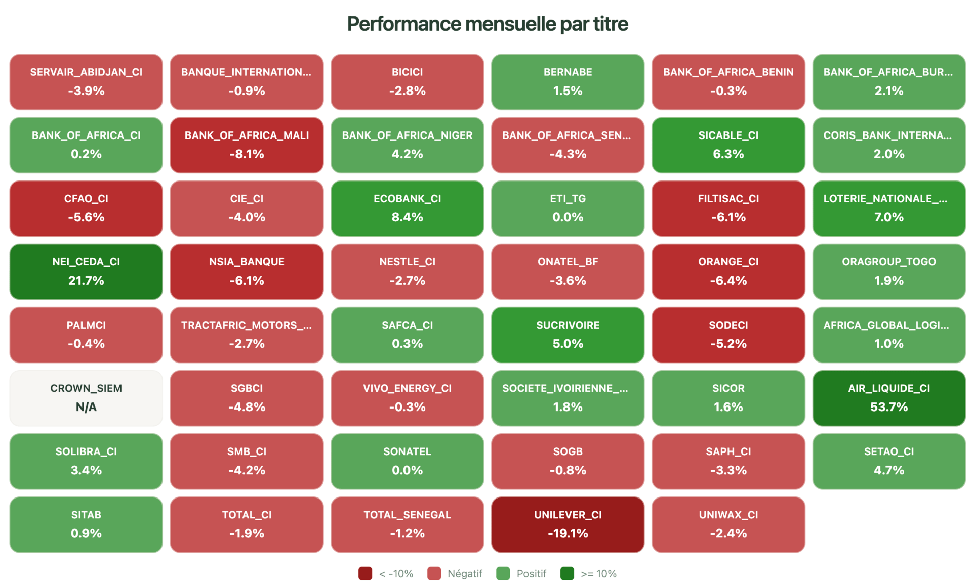 Cette semaine, notre heatmap indique que le marché est clairement en phase de correction avec de nombreux titres dans le rouge sur le mois glissant.